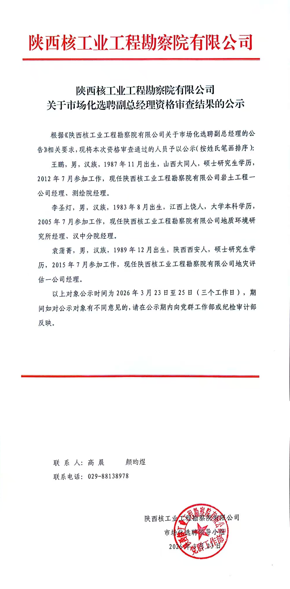 关于市场化选聘副总经理资格审查结果的公示