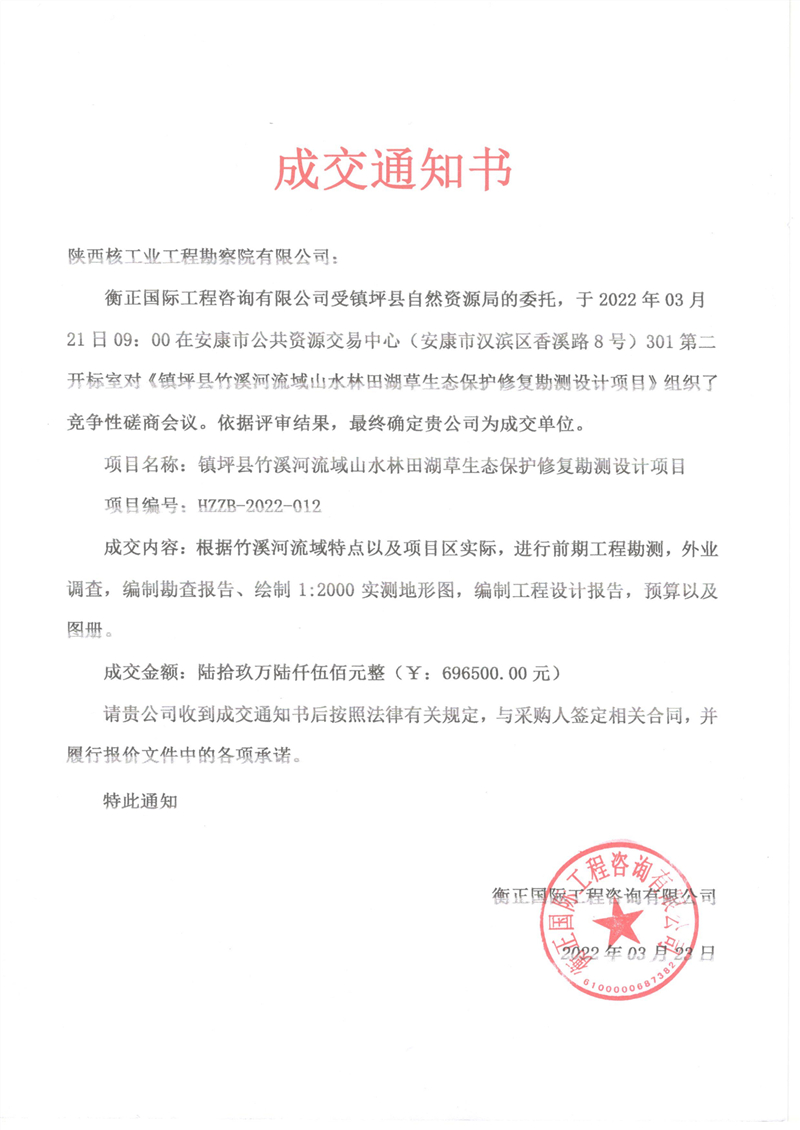 近日,土地工程公司成功中标镇坪县竹溪河流域山水林田湖草生态保护修复勘测设计项目,中标金额为69.65万元。