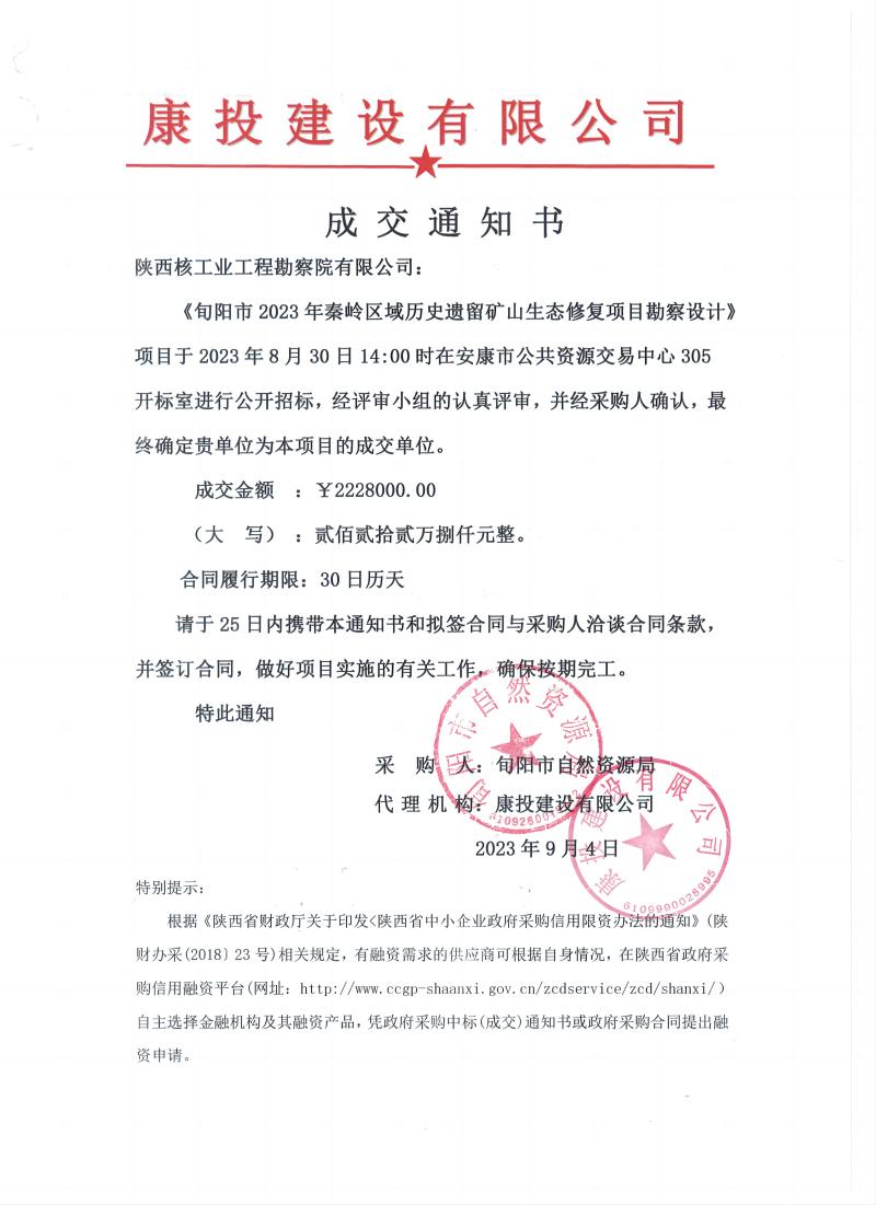 近日,工勘院成功中标旬阳市2023年秦岭区域历史遗留矿山生态修复勘察设计项目,中标金额222.8万元。